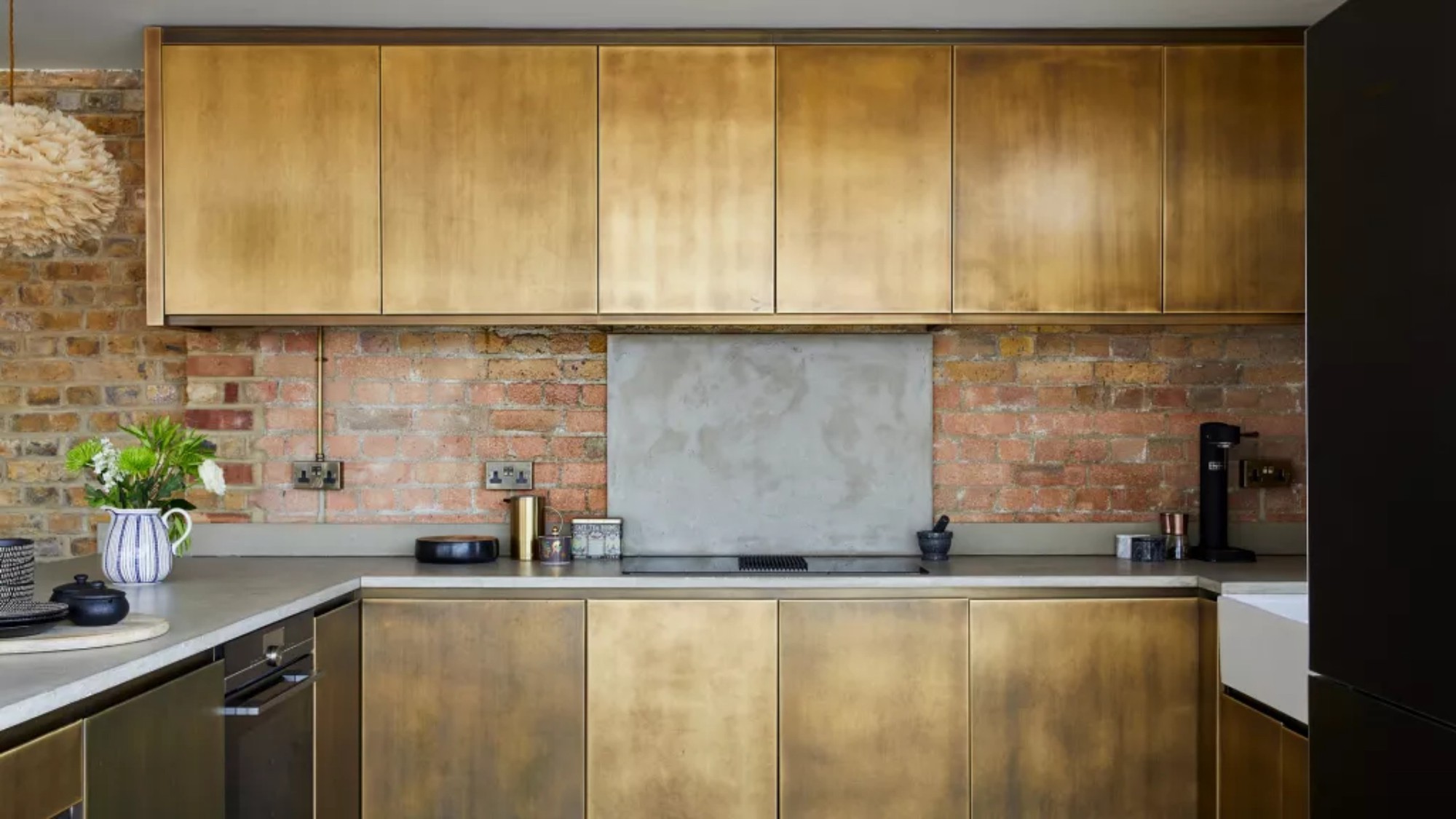 Tay nắm tủ bằng đồng, vòi bằng đồng và các phụ kiện có tone màu vàng như ấm đun nước và tủ đựng đồ để dễ dàng kết hợp những phần bổ sung tinh tế này vào không gian của bạn.